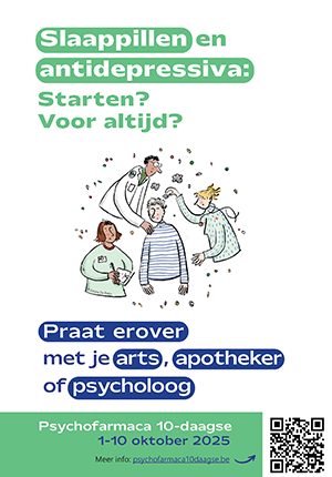 De Psychofarmaca 10-daagse is een campagne van 1 tot 10 oktober rond het gepast gebruik van slaapmedicatie en antidepressiva, gericht op zorgverleners en patiënten in de eerste lijn. Ontdek alle materiaal op psychofarmaca10daagse.be.
